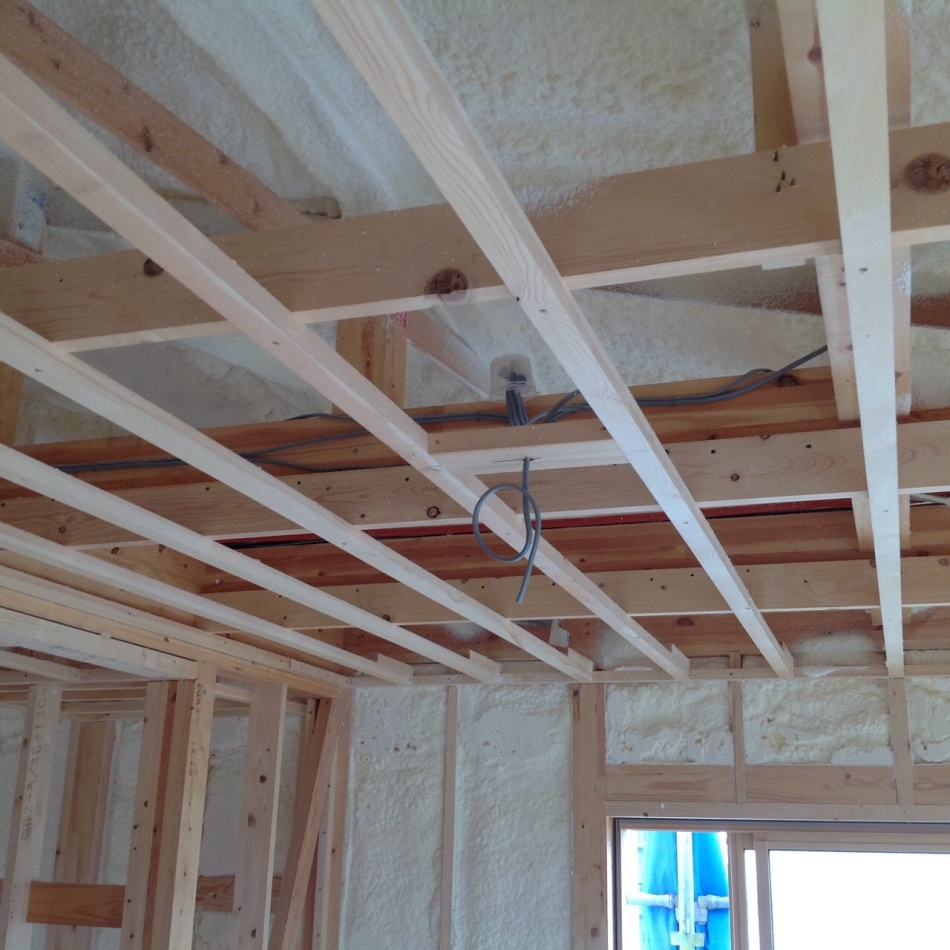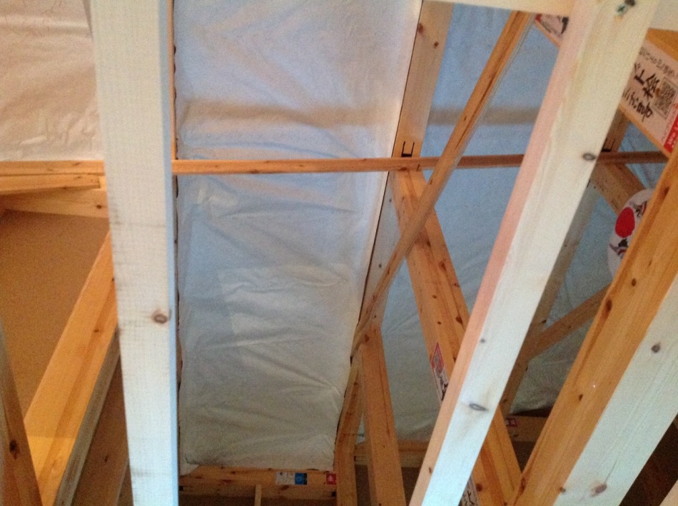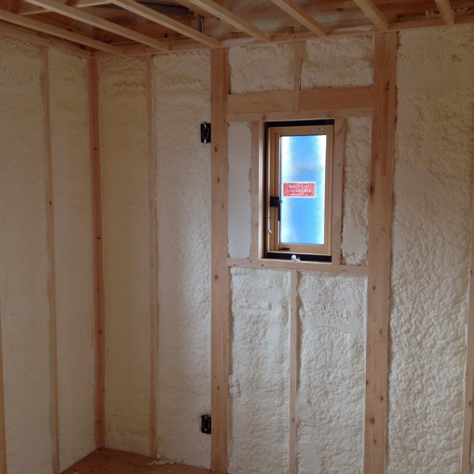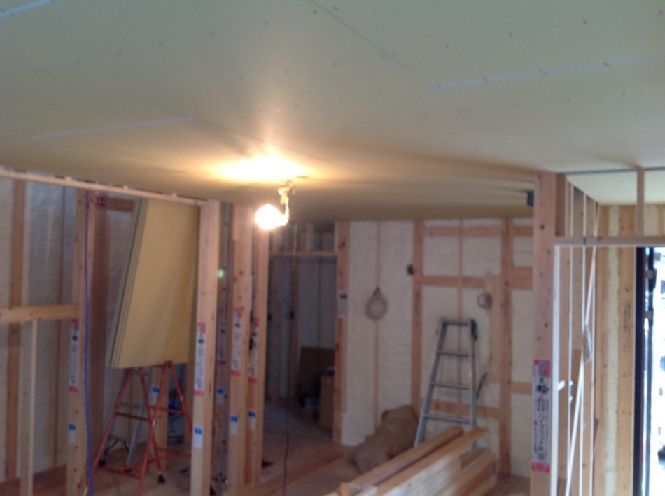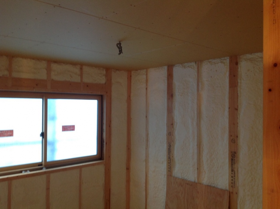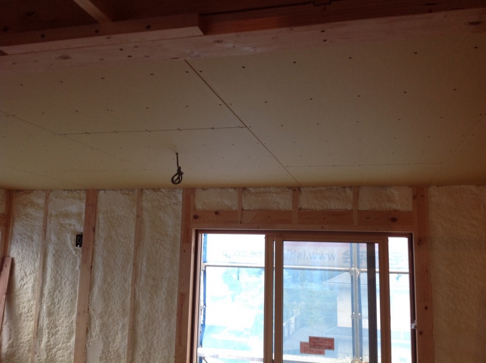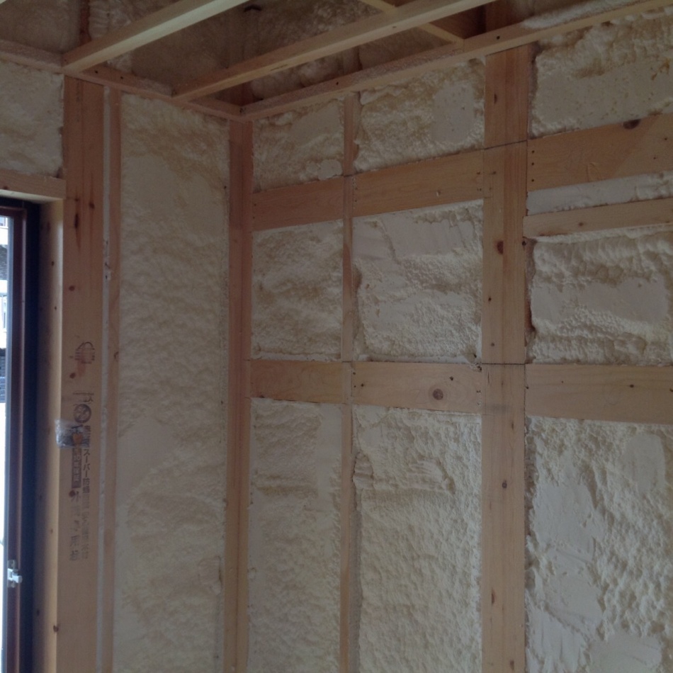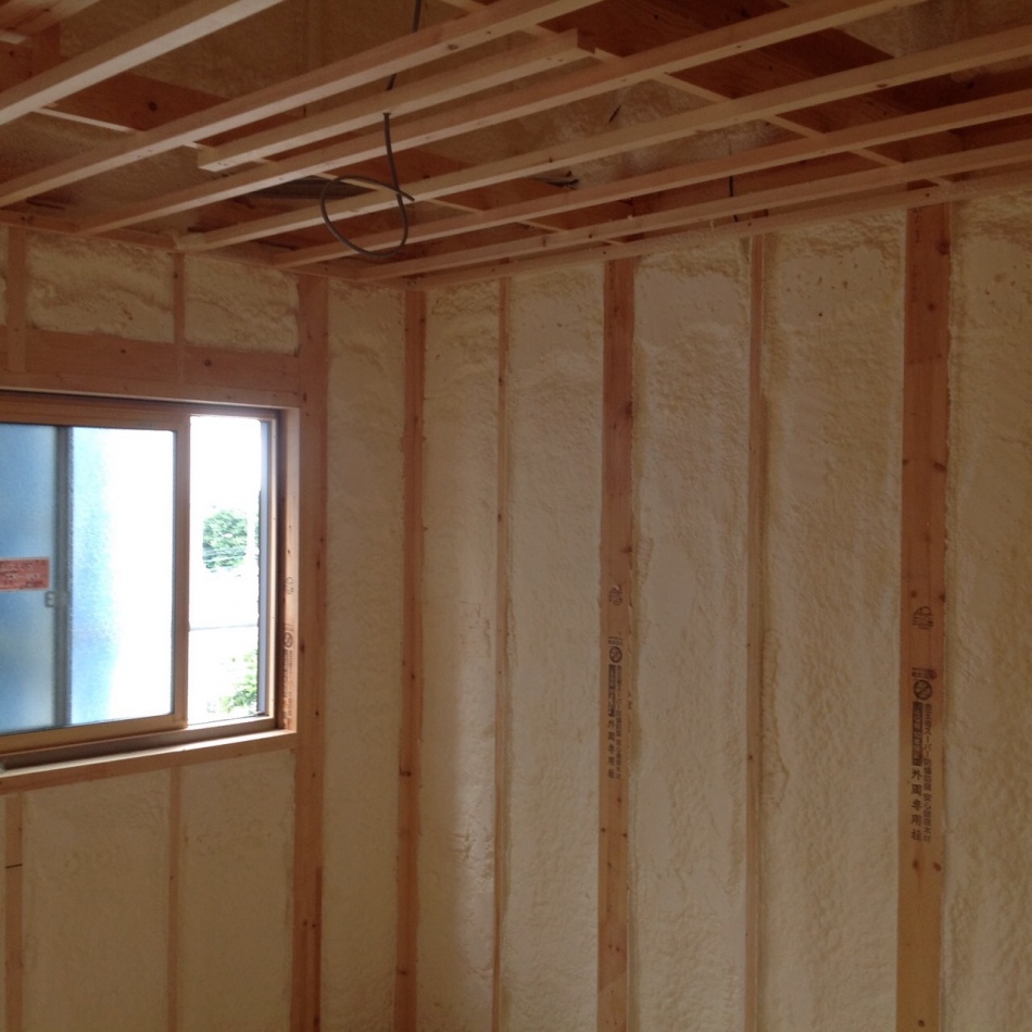 川口市I様邸はウレタン吹付断熱を施工しました。天井も壁もモコモコです。ミクロの泡が隅々まで入り込み自己接着するので,隙間の発生やずり落ちの心配もありません。