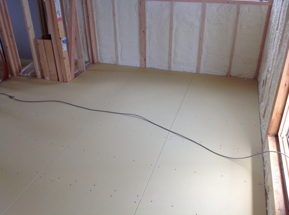 石膏ボードをフロアとの間に張ることによって下の階に音が響きにくくなります。