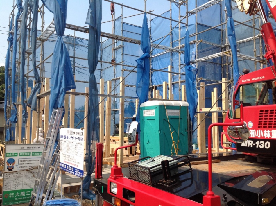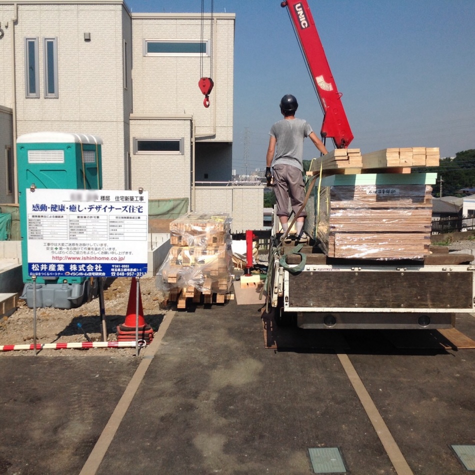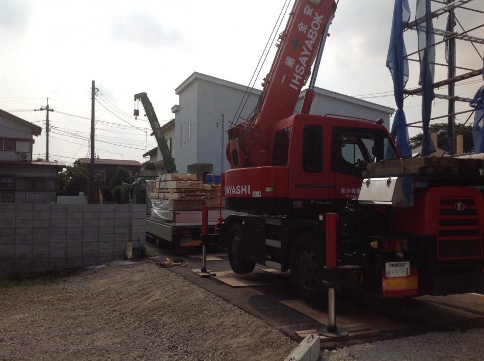 埼玉県川口市I様邸は上棟を行っています。クレーン車が入りまして建て方を行っています。天気も良く非常に暑いので安全第一で作業しています。