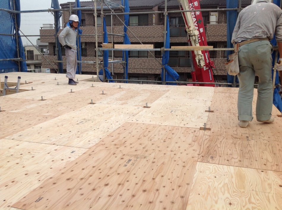 屋根下地の野地板張りを行いました。この後は耐力壁の外部パネル張りを行っています。