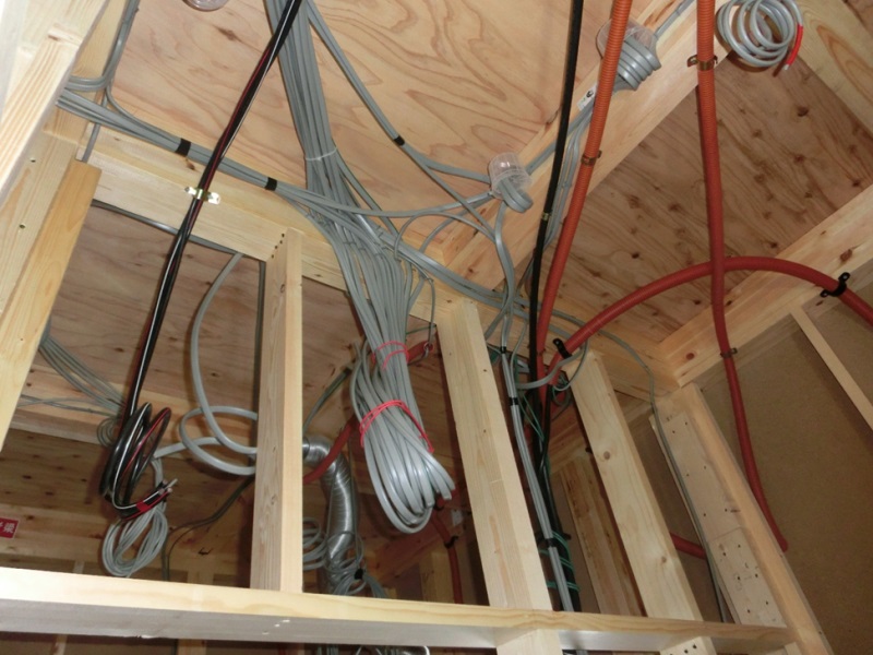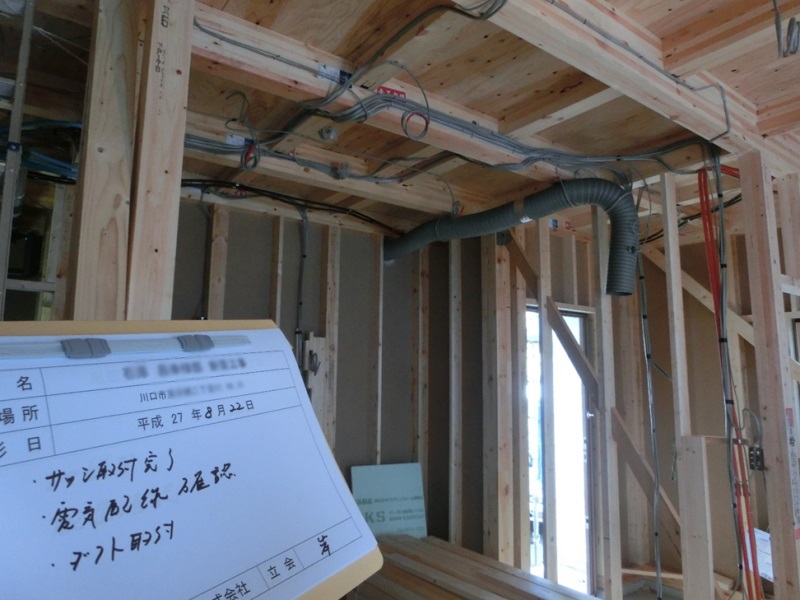 松井産業設計の騎士,一級建築士の岸です。本日はI様とサッシの取付状況と電気配線,換気設備の施工状況を確認しました。電気配線,電話,LANの配線状況の確認します。エコアイ換気(24時間全熱交換換気)の設置スペースの確認をしました。