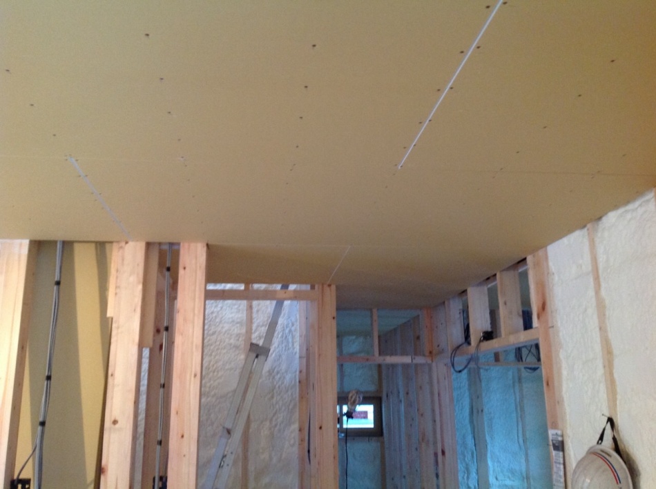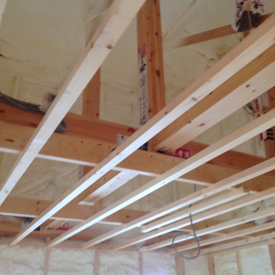 内装下地工事の状況確認をしました。天井は12.5mmの石膏ボード張りとなります。
