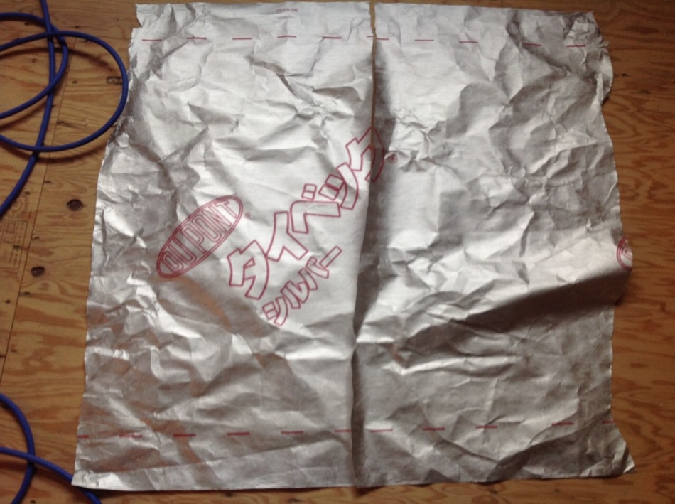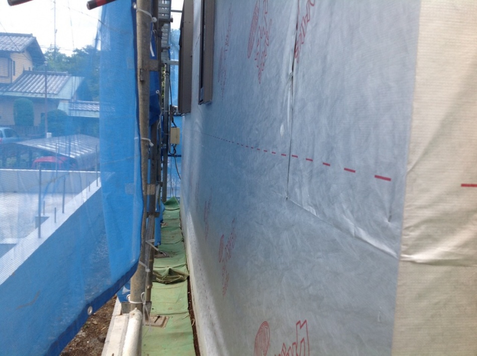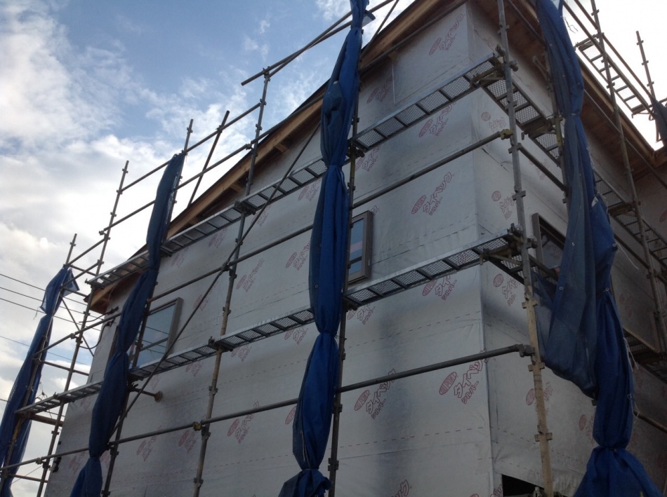 埼玉県川口市I様邸外壁下地のタイベックシルバー張りが完了しました。小屋裏のタイベックシルバー同様に太陽からの熱を反射して夏涼しく冬暖かな家になります。