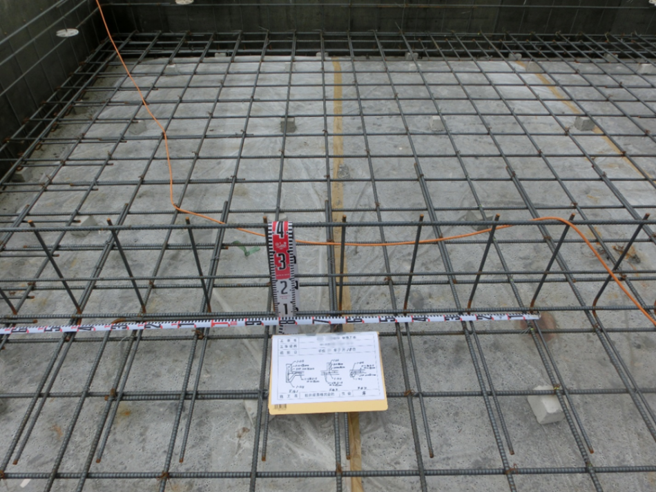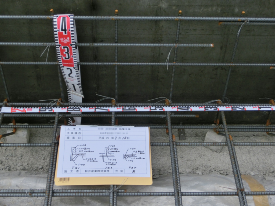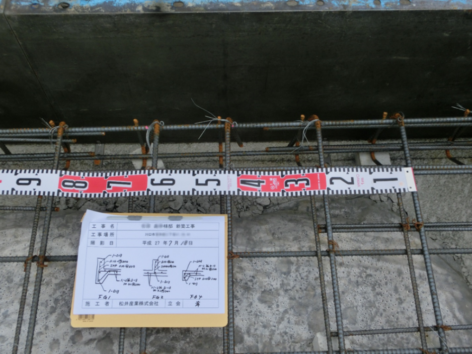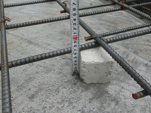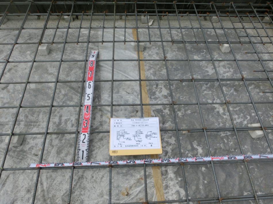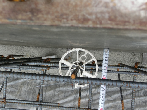鉄筋のカブリ(鉄筋をおおうコンクリートの厚さ)が所定の寸法が取れているか確認します。