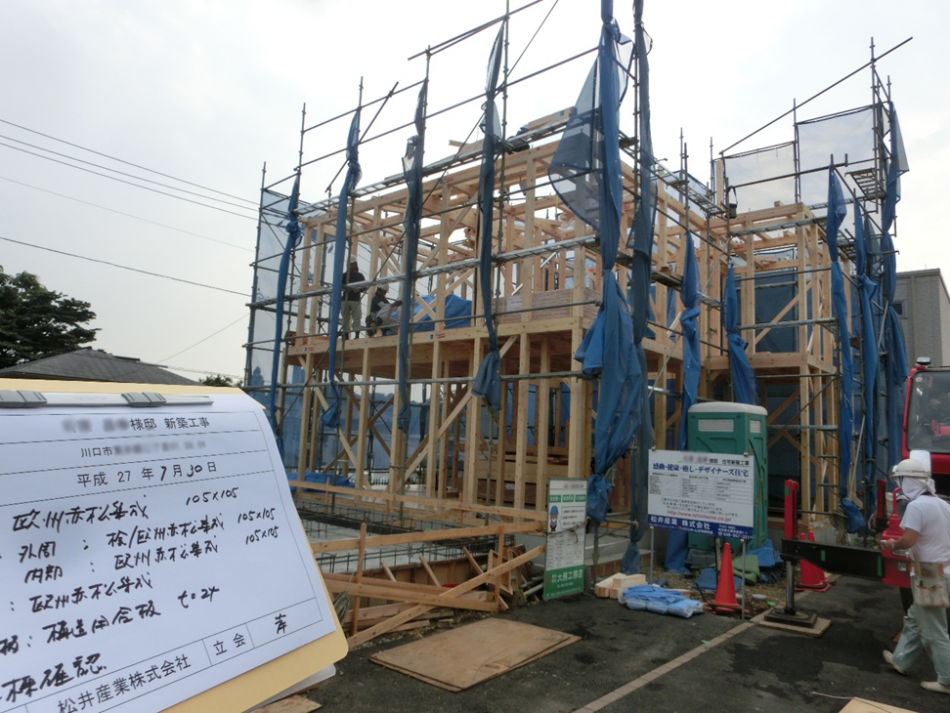 松井産業設計士の岸です。川口市のI様邸は検査官のチェックを受けています。