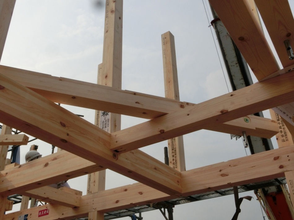 15時の休憩前野状態です。2階の小屋組みがかかりまして母屋,小屋束を立てていくところです。