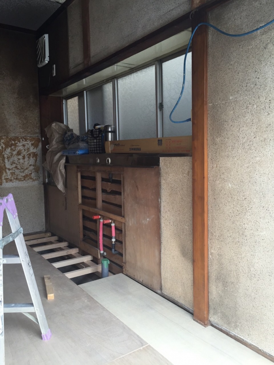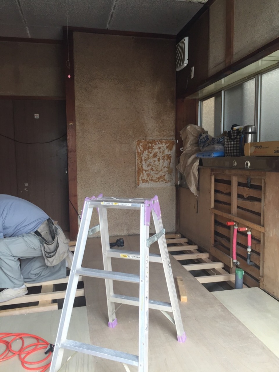 【東京都葛飾区】K様邸内装工事-フローリング工事が完了しキッチン取付工事にかかっています。