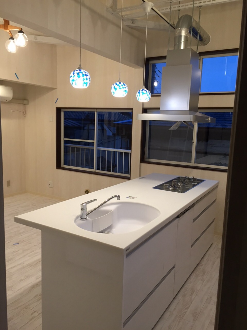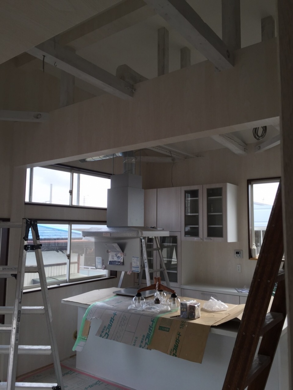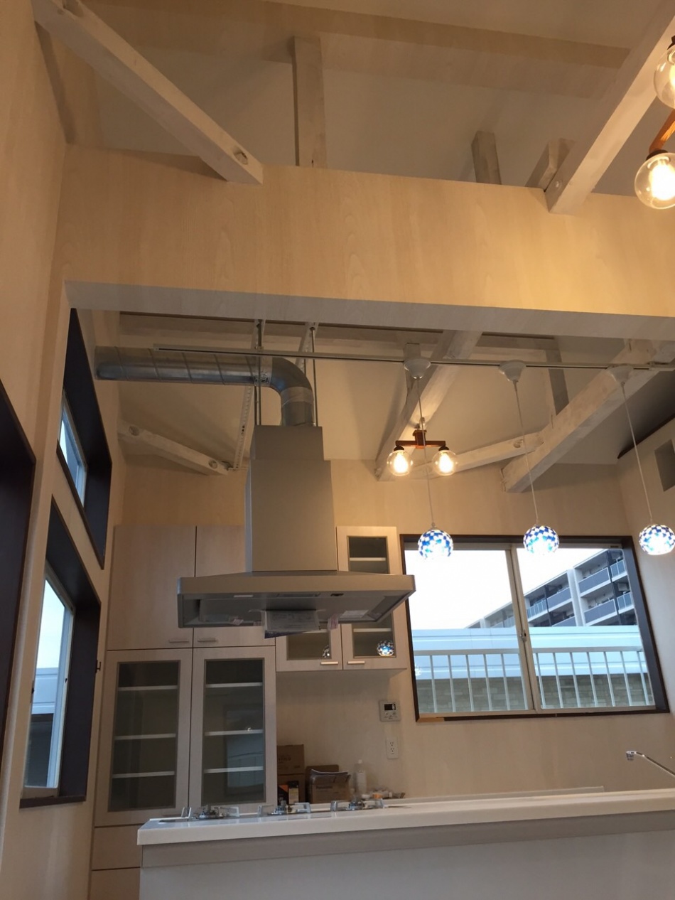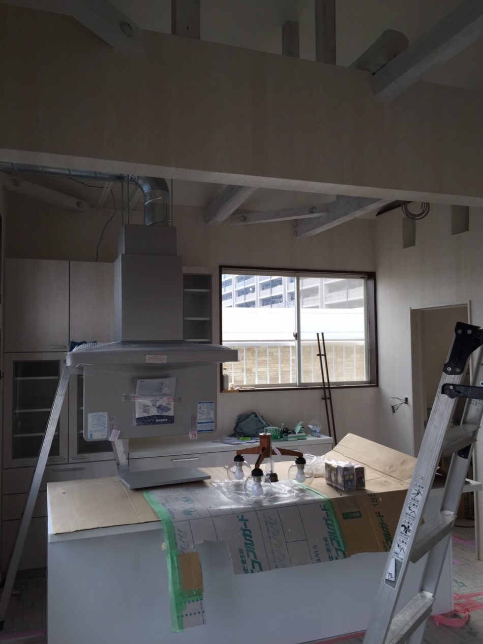 クロス,内装工事,キッチンダクト結び,照明器具取付の工事の後にクリーニングを行い完了です。完成が楽しみです。