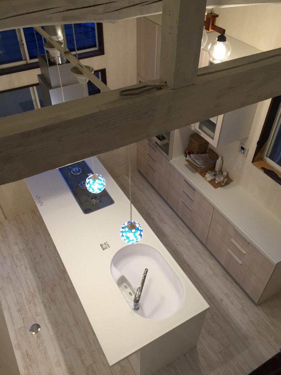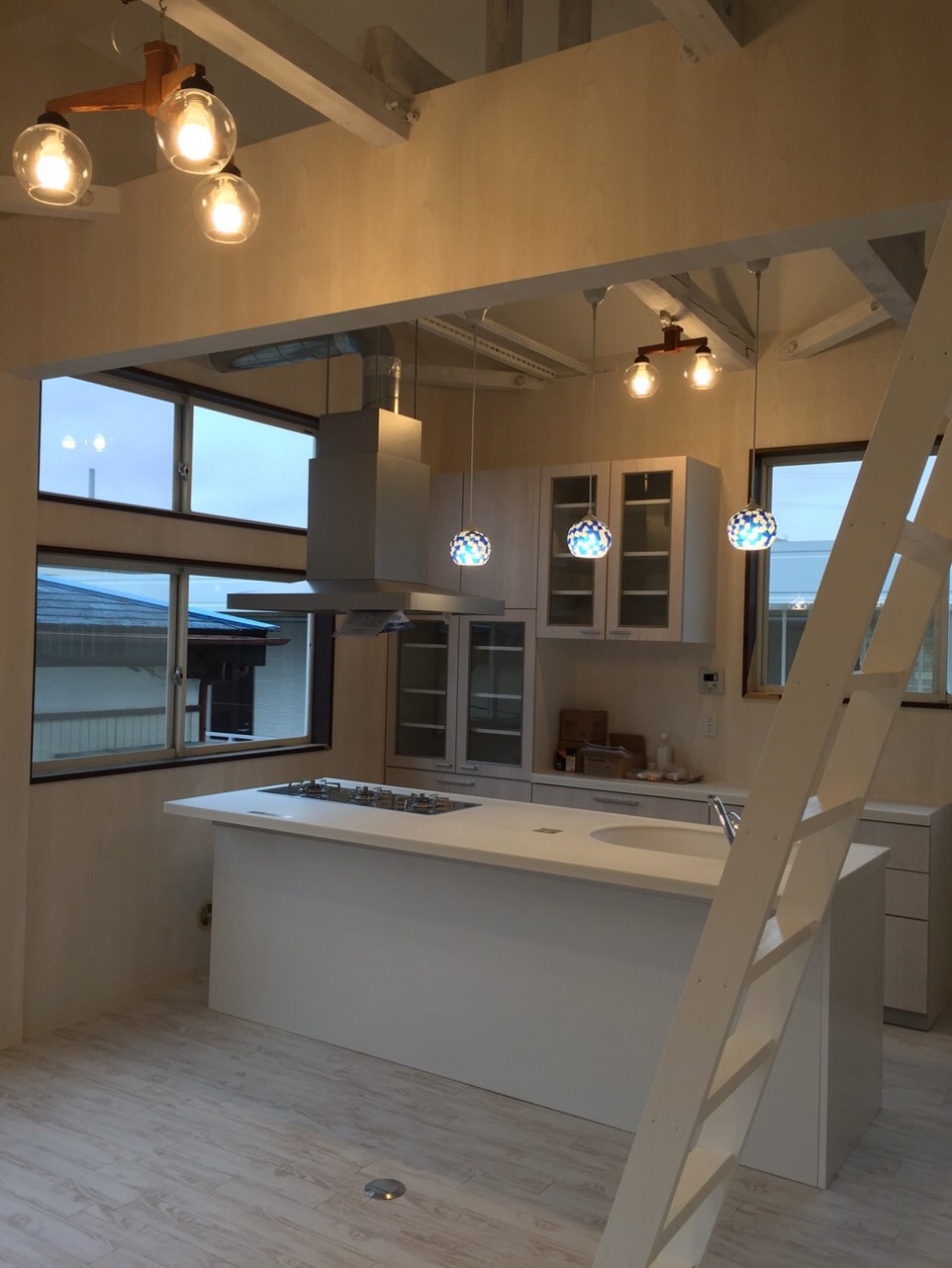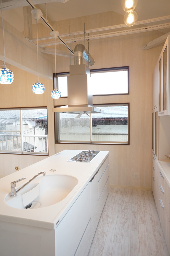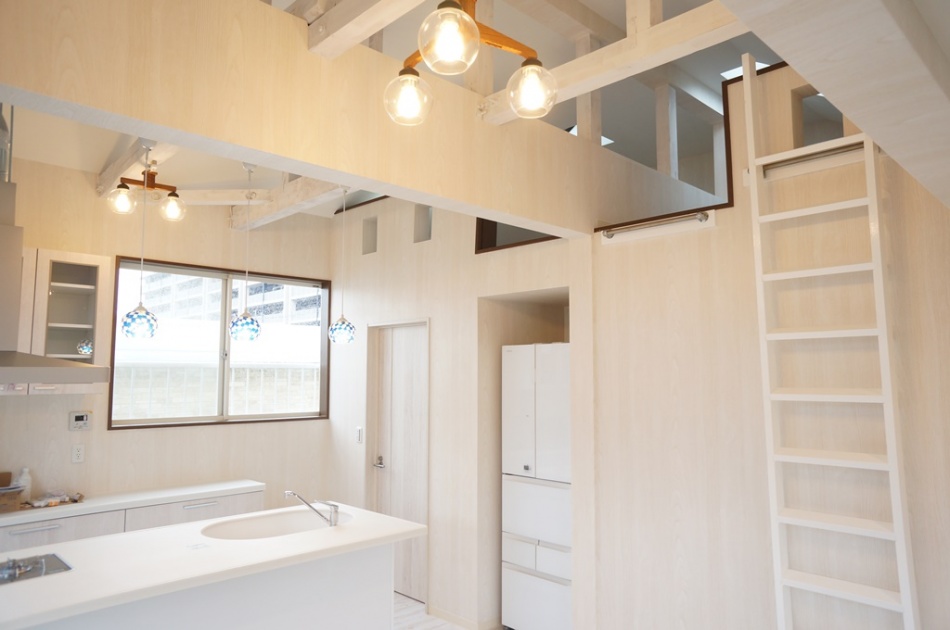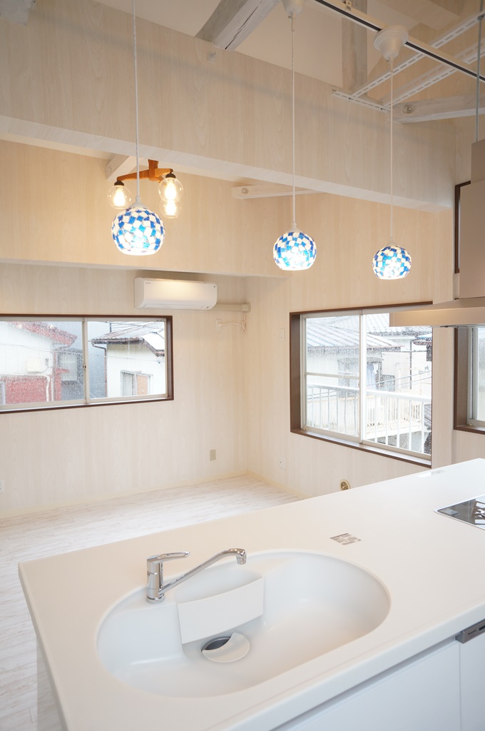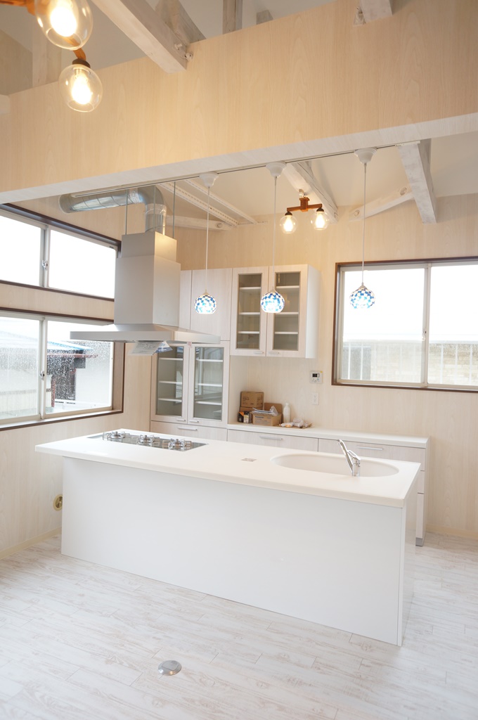 以前の間取りから間仕切り壁を撤去し,耐震用に大きな梁を入れ水回り設備を新たに取り付けて内装の色まで変化させました。