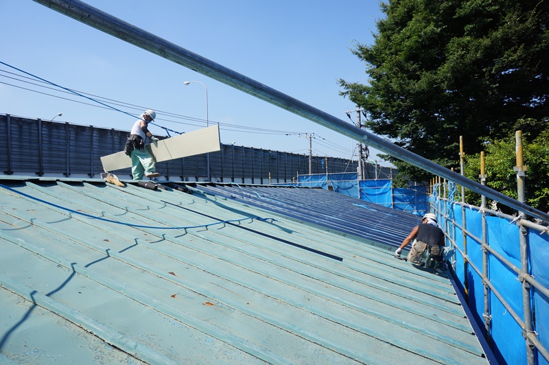 三郷市K様倉庫はカバー工法による補修工事を行っています。現在は屋根工事の段階です。アスファルトルーフィングと呼ばれる防水紙を敷設します。