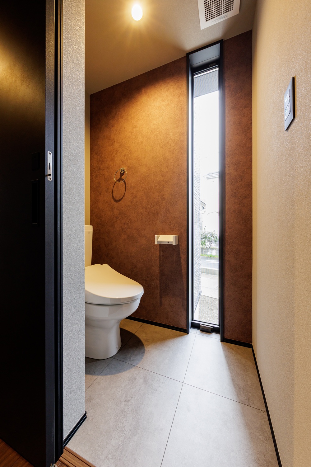 - 光を縦に紡ぐサニタリー: 縦長の開口部を設けた水回り。狭小空間に「垂直の光」を通すことで、閉塞感を一掃し、機能性と美意識を昇華させました。