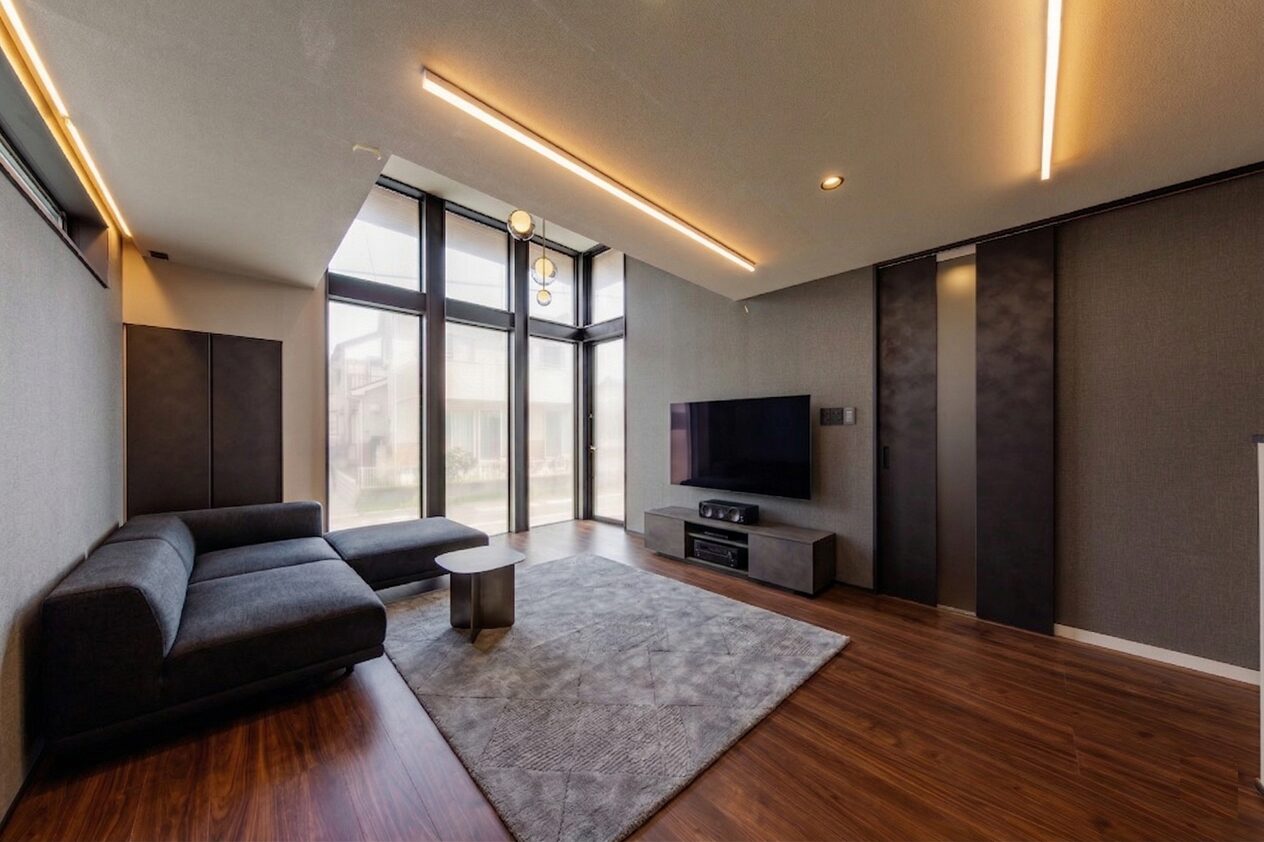 - 奥行きを創るライティング: 天井を走るシャープな発光ラインが、空間のパースを強調。日没後は、光と闇の美しいグラデーションが深い安らぎを誘います。
