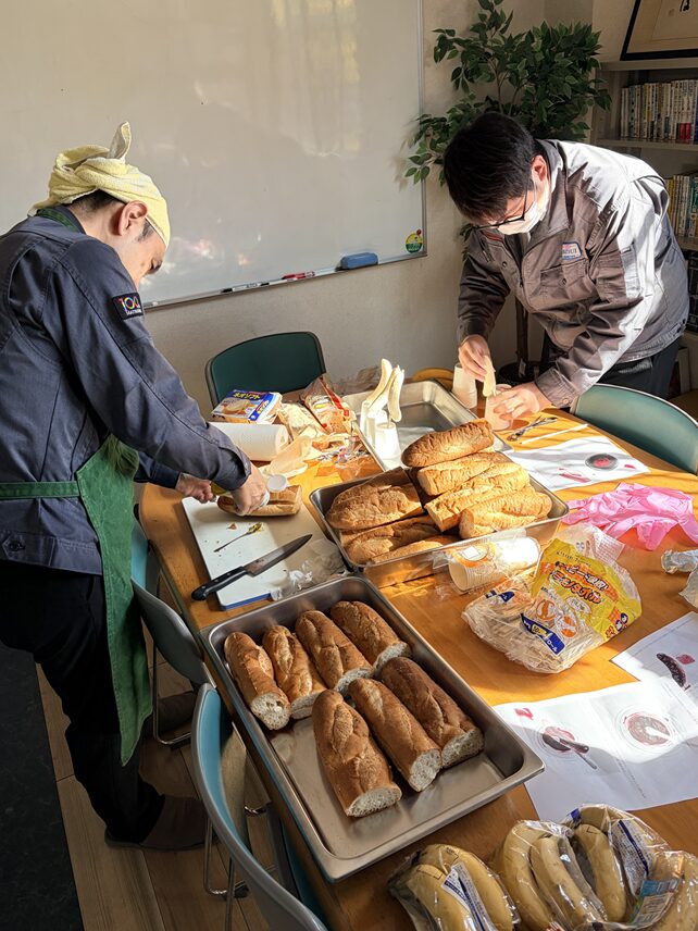 仕事の合間を縫って、有志たちがテキパキと仕込みを進めます。 フランスパンに切れ目を入れ、具材をたっぷりと詰め込む作業は、まさに共同作業。 真剣な表情でマスタードを塗る姿に、仕事に通じる「こだわり」を感じますね。