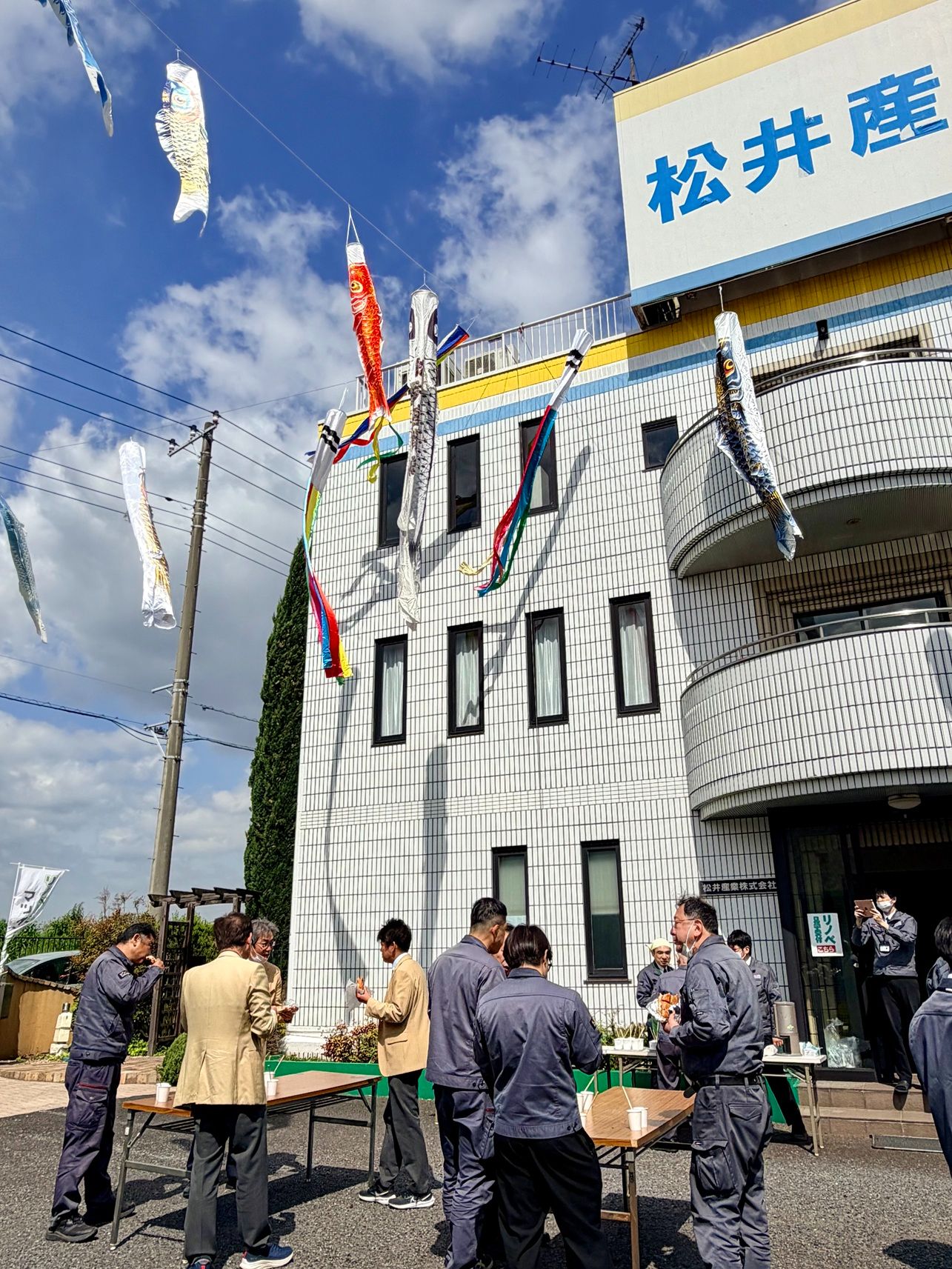 外に出ると、春の風に乗って鯉のぼりが元気よく泳いでいました。 その下で、温かいコーヒーを片手に、出来たてのパンをみんなでガブリ! スーツ姿も作業着姿も関係なく、ワイワイと食事を楽しむことで、自然とチームの絆が深まります。